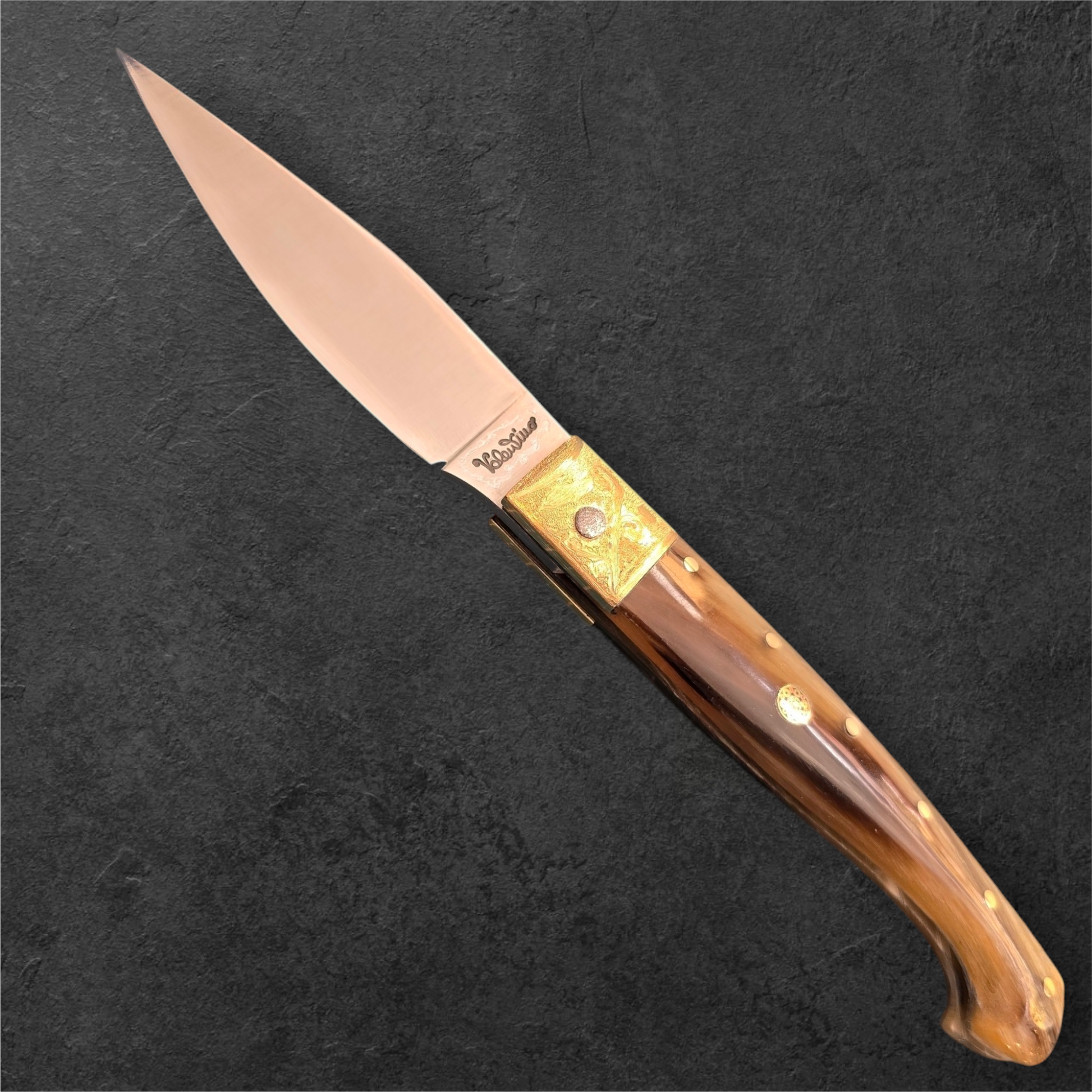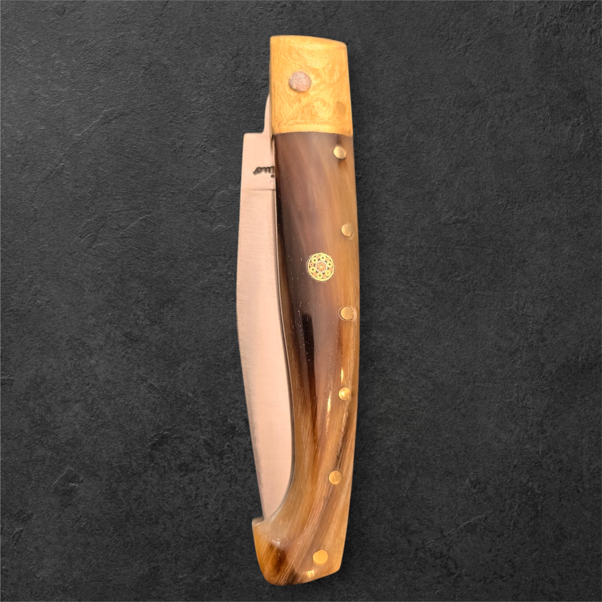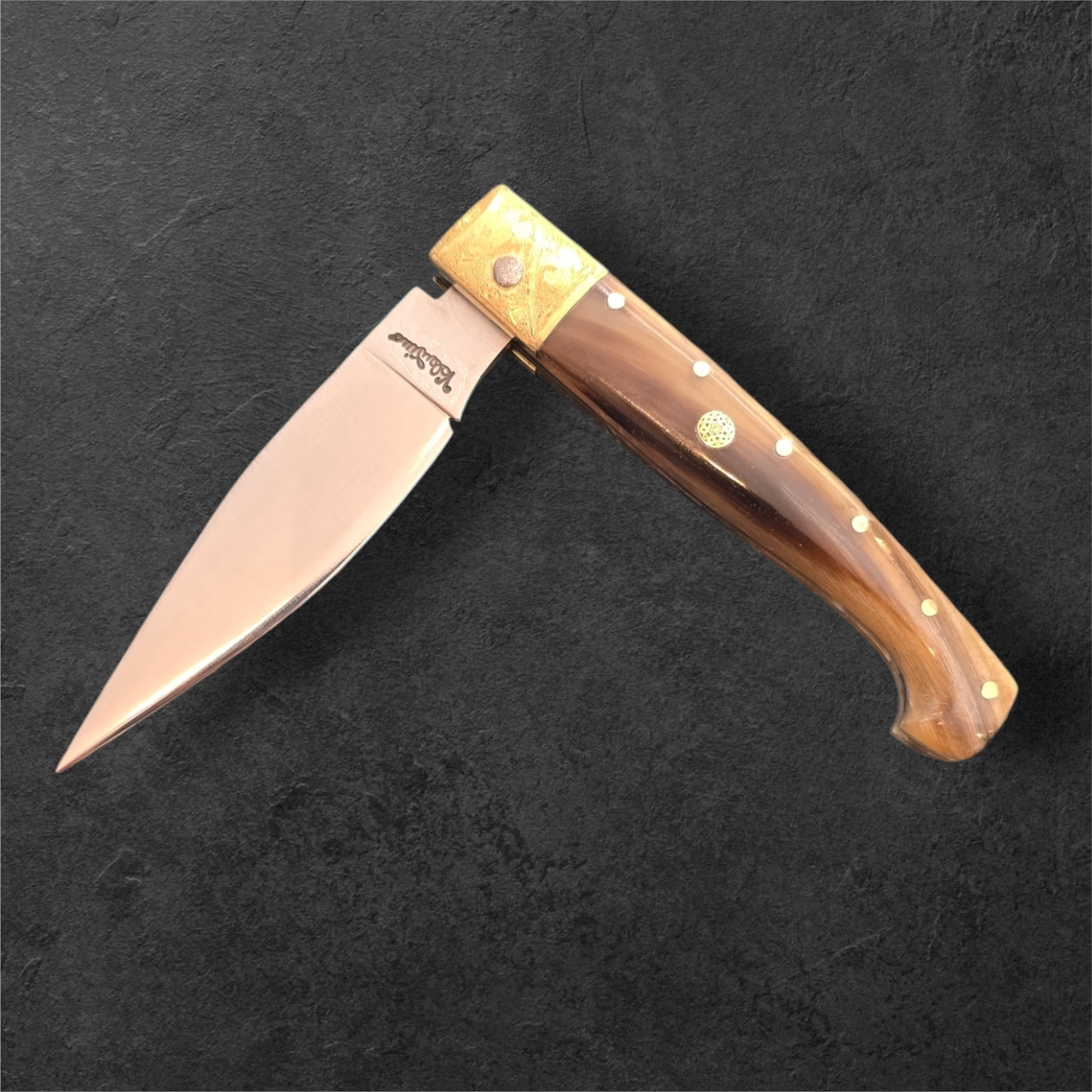 Manico: Realizzato in pregiato corno di montone, lavorato con cura per esaltare le venature naturali e conferire unicità a ogni pezzo.
